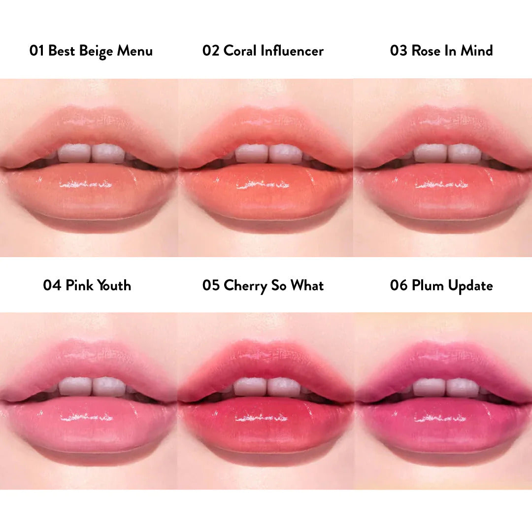 01 Best Beige Menu: Water, Diphenyl Dimethicone, Diisostearyl Malate, Bis-Diglyceryl Polyacyladipate-2, Hydrogenated Polyisobutene, Bis-Behenyl/Isostearyl/Phytosteryl Dimer Dilinoleyl Dimer Dilinoleate, Diglycerin, Cetyl PEG/PPG-10/1 Dimethicone, Dipropylene Glycol, Hydrogenated Poly(C6-14 Olefin), Polysorbate 60, Sorbitan Isostearate, Diisostearoyl Polyglyceryl-3 Dimer Dilinoleate, Pentylene Glycol, Hydroxyethyl Acrylate/Sodium Acryloyldimethyl Taurate Copolymer, Caprylic/Capric Triglyceride, Squalane, Ceteareth-20, Ethylene/Propylene Copolymer, Phenoxyethanol, Glycerin, Titanium Dioxide (Ci 77891), Polyglycerin-3, Yellow 6 (Ci 15985), Fragrance, Ethylhexylglycerin, Red 33 (Ci 17200), Red 28 (Ci 45410), Blue 1 (Ci 42090), Hamamelis Virginiana (Witch Hazel) Leaf Extract, Lilium Tigrinum Extract, Butylene Glycol. 02 Coral Influender: Water, Diphenyl Dimethicone, Diisostearyl Malate, Bis-Diglyceryl Polyacyladipate-2, Hydrogenated Polyisobutene, Bis-Behenyl/Isostearyl/Phytosteryl Dimer Dilinoleyl Dimer Dilinoleate, Diglycerin, Cetyl PEG/PPG-10/1 Dimethicone, Dipropylene Glycol, Hydrogenated Poly(C6-14 Olefin), Polysorbate 60, Sorbitan Isostearate, Diisostearoyl Polyglyceryl-3 Dimer Dilinoleate, Pentylene Glycol, Hydroxyethyl Acrylate/Sodium Acryloyldimethyl Taurate Copolymer, Caprylic/Capric Triglyceride, Squalane, Ceteareth-20, Ethylene/Propylene Copolymer, Phenoxyethanol, Glycerin, Titanium Dioxide (Ci 77891), Yellow 6 (Ci 15985), Polyglycerin-3, Fragrance, Ethylhexylglycerin, Red 33 (Ci 17200), Red 28 (Ci 45410), Blue 1 (Ci 42090), Hamamelis Virginiana (Witch Hazel) Leaf Extract, Lilium Tigrinum Extract, Butylene Glycol. 03 Rose In Mind: Water, Diphenyl Dimethicone, Diisostearyl Malate, Bis-Diglyceryl Polyacyladipate-2, Hydrogenated Polyisobutene, Bis-Behenyl/Isostearyl/Phytosteryl Dimer Dilinoleyl Dimer Dilinoleate, Diglycerin, Cetyl PEG/PPG-10/1 Dimethicone, Dipropylene Glycol, Hydrogenated Poly(C6-14 Olefin), Polysorbate 60, Sorbitan Isostearate, Diisostearoyl Polyglyceryl-3 Dimer Dilinoleate, Pentylene Glycol, Hydroxyethyl Acrylate/Sodium Acryloyldimethyl Taurate Copolymer, Caprylic/Capric Triglyceride, Squalane, Ceteareth-20, Ethylene/Propylene Copolymer, Phenoxyethanol, Glycerin, Titanium Dioxide (Ci 77891), Polyglycerin-3, Yellow 6 (Ci 15985), Fragrance, Ethylhexylglycerin, Red 28 (Ci 45410), Red 33 (Ci 17200), Blue 1 (Ci 42090), Hamamelis Virginiana (Witch Hazel) Leaf Extract, Lilium Tigrinum Extract, Butylene Glycol. 04 Pink Youth: Water, Diphenyl Dimethicone, Diisostearyl Malate, Bis-Diglyceryl Polyacyladipate-2, Hydrogenated Polyisobutene, Bis-Behenyl/Isostearyl/Phytosteryl Dimer Dilinoleyl Dimer Dilinoleate, Diglycerin, Cetyl PEG/PPG-10/1 Dimethicone, Dipropylene Glycol, Hydrogenated Poly(C6-14 Olefin), Polysorbate 60, Sorbitan Isostearate, Diisostearoyl polyglyceryl-3 Dimer Dilinoleate, Pentylene Glycol, Hydroxyethyl Acrylate/Sodium Acryloyldimethyl Taurate Copolymer, Caprylic/Capric Triglyceride, Squalane, Ceteareth-20, Titanium Dioxide (CI 77891), Ethylene/Propylene Copolymer, Phenoxyethanol, Polyglycerin-3, Fragrance, Red 33 (CI 17200), Ethylhexylglycerin, Yellow 5 (CI 19140), Glycerin, Red 28 (CI 45410), Yellow 6 (CI 15985), Aluminum Hydroxide, Ammonium Polyacrylate, Butylene Glycol, Blue 1 (CI 42090), Hamamelis Virginiana (Witch Hazel) Leaf Extract, Lilium Tigrinum Extract. 05 Cherry So What: Water, Diphenyl Dimethicone, Diisostearyl Malate, Bis-Diglyceryl Polyacyladipate-2, Hydrogenated Polyisobutene, Bis-Behenyl/Isostearyl/Phytosteryl Dimer Dilinoleyl Dimer Dilinoleate, Diglycerin, Cetyl PEG/PPG-10/1 Dimethicone, Dipropylene Glycol, Hydrogenated Poly(C6-14 Olefin), Polysorbate 60, Sorbitan Isostearate, Diisostearoyl Polyglyceryl-3 Dimer Dilinoleate, Pentylene Glycol, Hydroxyethyl Acrylate/Sodium Acryloyldimethyl Taurate Copolymer, Caprylic/Capric Triglyceride, Squalane, Ceteareth-20, Ethylene/Propylene Copolymer, Phenoxyethanol, Polyglycerin-3, Red 33 (Ci 17200), Fragrance, Ethylhexylglycerin, Yellow 5 (Ci 19140), Red 28 (Ci 45410), Glycerin, Yellow 6 (Ci 15985), Blue 1 (Ci 42090), Hamamelis Virginiana (Witch Hazel) Leaf Extract, Lilium Tigrinum Extract, Butylene Glycol. 06 Plum Update: Water, Diphenyl Dimethicone, Diisostearyl Malate, Bis-Diglyceryl Polyacyladipate-2, Hydrogenated Polyisobutene, Bis-Behenyl/Isostearyl/Phytosteryl Dimer Dilinoleyl Dimer Dilinoleate, Diglycerin, Cetyl PEG/PPG-10/1 Dimethicone, Dipropylene Glycol, Hydrogenated Poly(C6-14 Olefin), Polysorbate 60, Sorbitan Isostearate, Diisostearoyl Polyglyceryl-3 Dimer Dilinoleate, Pentylene Glycol, Hydroxyethyl Acrylate/Sodium Acryloyldimethyl Taurate Copolymer, Caprylic/Capric Triglyceride, Squalane, Ceteareth-20, Ethylene/Propylene Copolymer, Phenoxyethanol, Polyglycerin-3, Red 33 (Ci 17200), Fragrance, Glycerin, Titanium Dioxide (Ci 77891), Ethylhexylglycerin, Yellow 6 (Ci 15985), Red 28 (Ci 45410), Blue 1 (Ci 42090), Hamamelis Virginiana (Witch Hazel) Leaf Extract, Lilium Tigrinum Extract, Butylene Glycol.